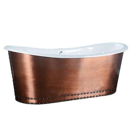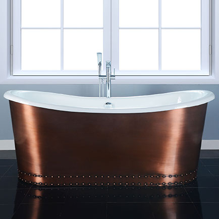 This fabulous large French Bateau tub package from Baths is truly stunning. A combination of a sensual shape and a copper skirt exterior. To further enhance the elegance, This package is currently supplied with a freestanding tub faucet and a tub drain, all in beautiful polished chrome.