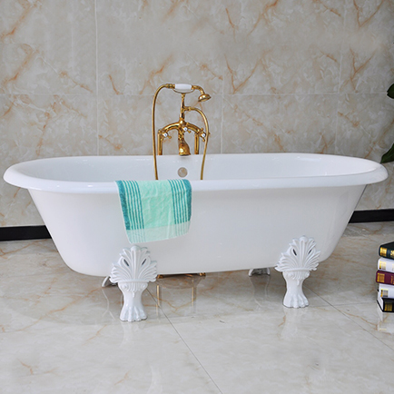 This beautiful freestandig cast iron tub comes with a elegant roll top design with stable paw feet. The tub rim is available with continuous rolled rim or with flat area for faucet holes for your option. The lion paw feet makes the tub a traditional addtion to your bathroom.This Roll Top Cast Iron Bath includes lion paw feet in a range of different finishes, including chrome, white, brushed nickel, polished nickel, polished brass, oil rubbed bronze and etc. The outside of the bath can be finsh