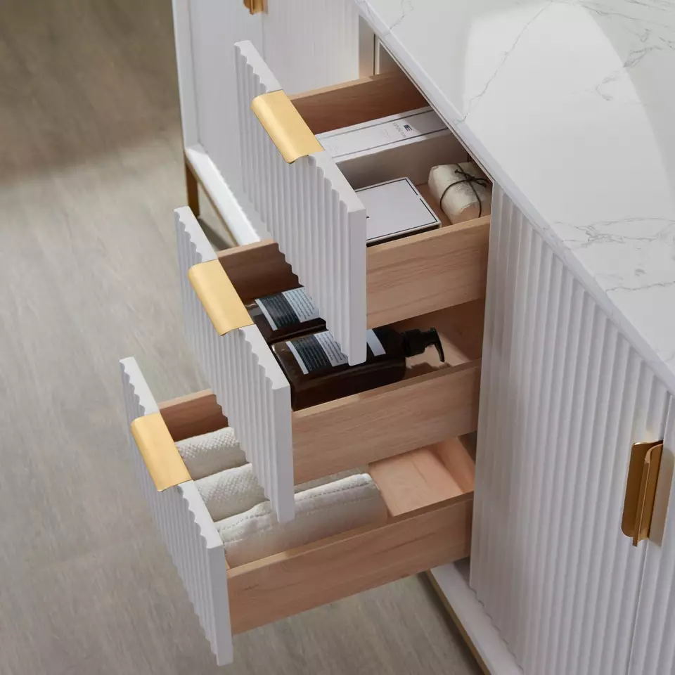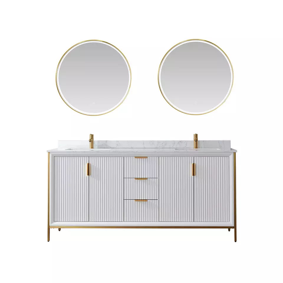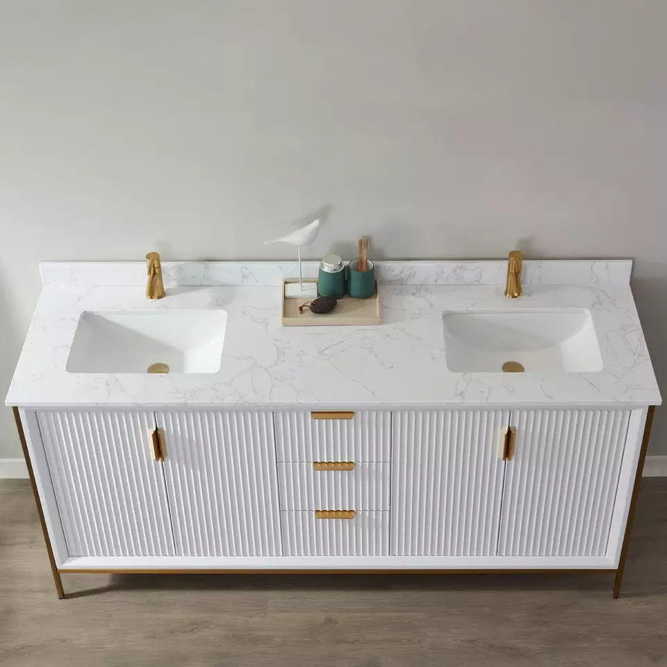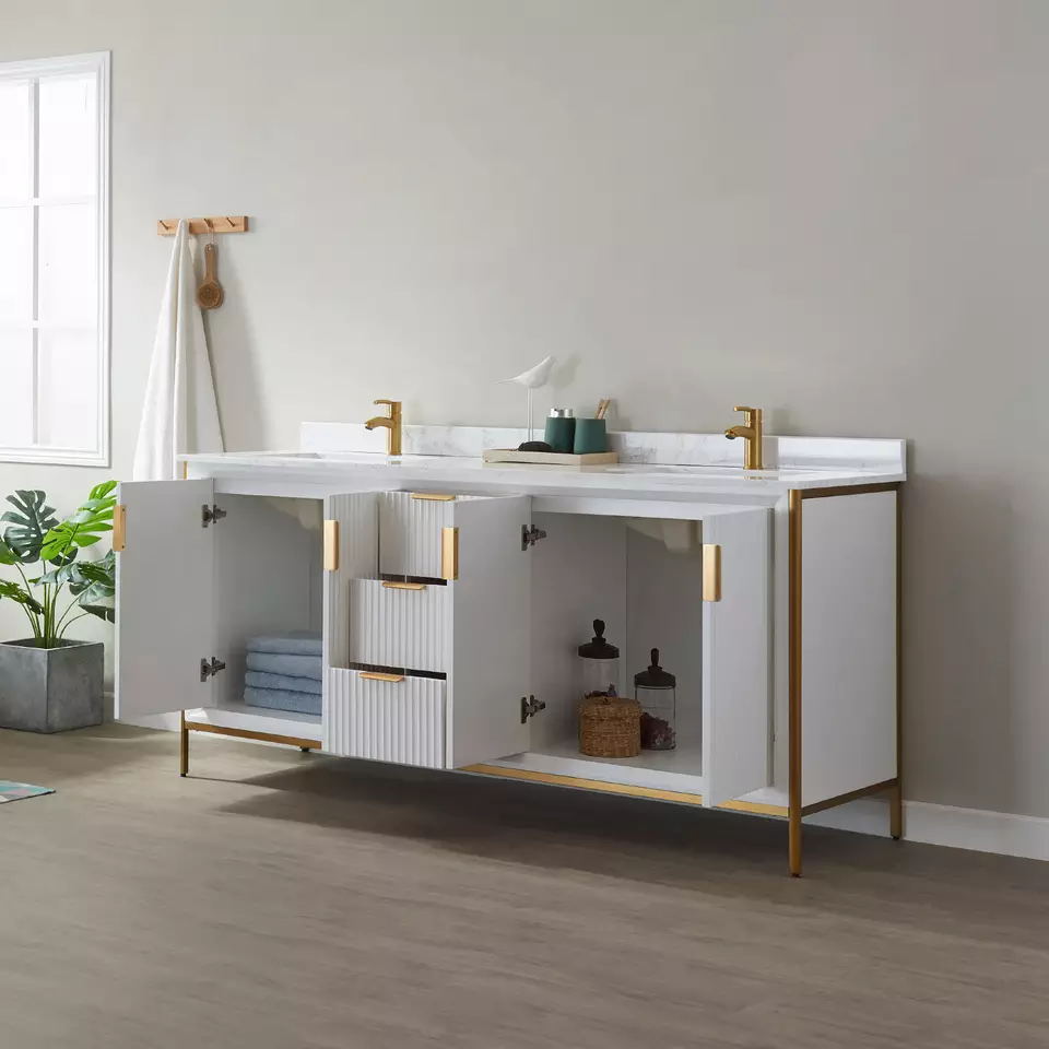 Production Name | 72 inch luxury bathroom furniture bathroom cabinet floor standing | VANITY Model NO. | JC-8219 | BATHROOM VANITY | (opt) integrated vanity top (opt) Porcelain basin (opt) Back and side splash are optional (opt) Mirror | Countertop Material option | Artificial Granite, Artificial Marble, Quartz, Granite, Marble, Pure Acrylic, Resin, Solid Surface | BATHROOM VANITY CABINETS : Plywood & Birch& pine wood : Beautifully designed vanity sets are constructed from premium solid hardwood which enables these units to withstand more pressure, weight, and usage over time. This material allows for longer lifespans compared to units constructed from MDF or particle boards. | * Solid birch hardwood frame with high quality plywood panel for a sturdy cabinet * 3 coats of premium paint, 2 coats of water and scratch-resistant enamel for durable rich cabinet finish * DTC soft-closing drawer glides. * Vanity comes pre-assembled * Countertop drilled for single hole faucet (faucet not included) * cUPC certified sink * CARB2 compliant