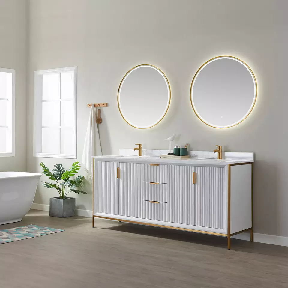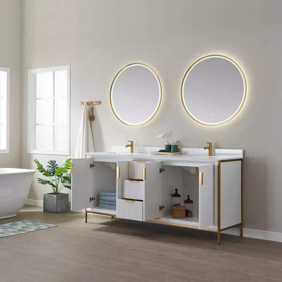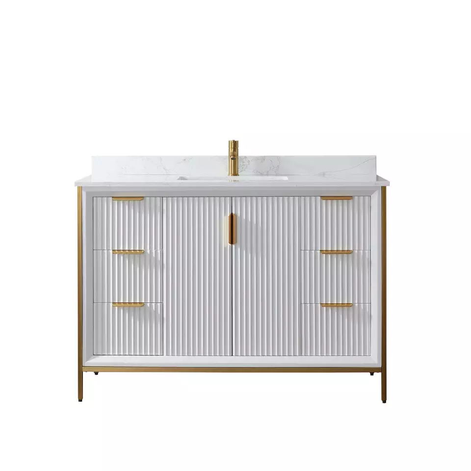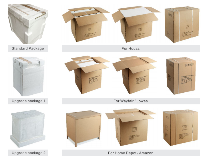 Production Name | 72 inch luxury bathroom furniture bathroom cabinet floor standing | VANITY Model NO. | JC-8219 | BATHROOM VANITY | (opt) integrated vanity top (opt) Porcelain basin (opt) Back and side splash are optional (opt) Mirror | Countertop Material option | Artificial Granite, Artificial Marble, Quartz, Granite, Marble, Pure Acrylic, Resin, Solid Surface | BATHROOM VANITY CABINETS : Plywood & Birch& pine wood : Beautifully designed vanity sets are constructed from premium solid hardwood which enables these units to withstand more pressure, weight, and usage over time. This material allows for longer lifespans compared to units constructed from MDF or particle boards. | * Solid birch hardwood frame with high quality plywood panel for a sturdy cabinet * 3 coats of premium paint, 2 coats of water and scratch-resistant enamel for durable rich cabinet finish * DTC soft-closing drawer glides. * Vanity comes pre-assembled * Countertop drilled for single hole faucet (faucet not included) * cUPC certified sink * CARB2 compliant