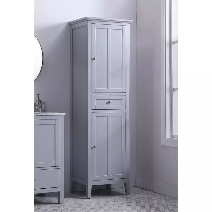Embodies a chic, contemporary aesthetic storage to your bathroom, features 2 soft-closing doors with shelving inside, a conveniently located drawer, stainless steel round knobs, stands on sleek faceted legs.